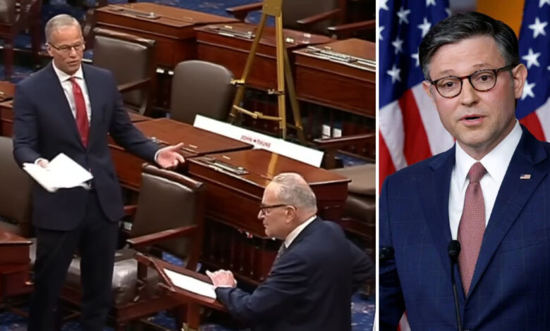 Speaker of the House Mike Johnson said Thursday that Democrats bear the blame for the pain of a government shutdown, as President Donald Trump and his budget chief moved forward with identifying federal programs to cut. “This is the way the system works. This is [Senate Minority Leader] Chuck Schumer’s decision, is to hand … the keys to the kingdom…